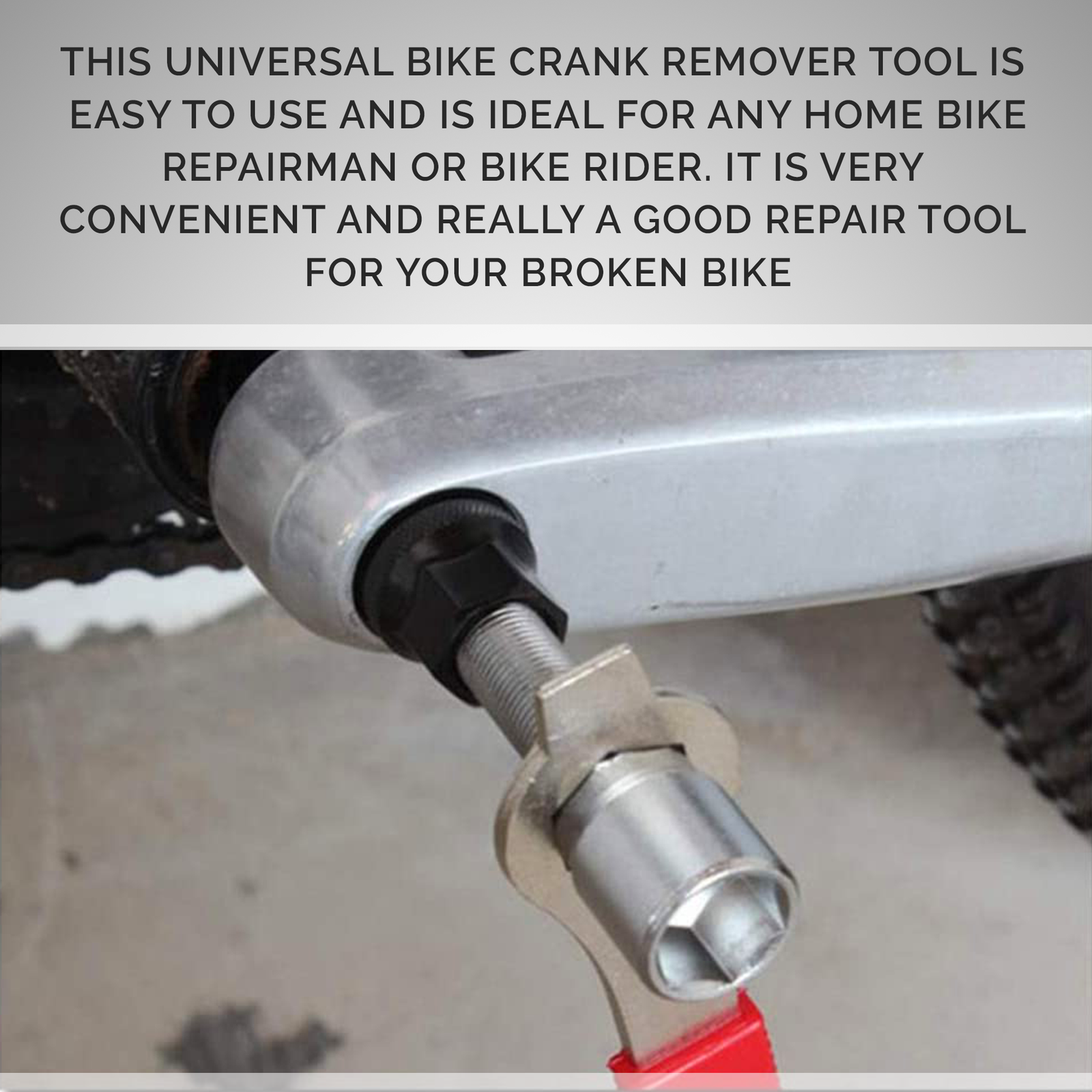 This universal bike crank remover tool is easy to use and is ideal for any home bike repairman or bike rider. It is very convenient and really a good repair tool for your broken bike. You remove the bolt in the crank arm, then screw the lower back part of the tool into the crank until it is tight. Screw in and tighten the silver piece of the tool until the crank starts to move.