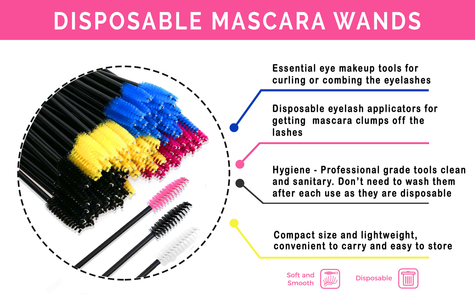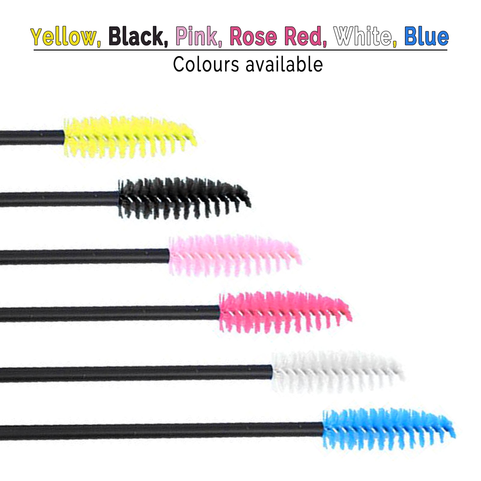 The disposable Mascara wands are professional grade hygienic tools for applying mascara. The spiral brush picks up just the right amount of product, working to evenly disperse and coat the area. The wands come in different colors (Black, Rose Red, Pink, Blue, White & Yellow) and are Supplied in packs of 50, 100, and 200.